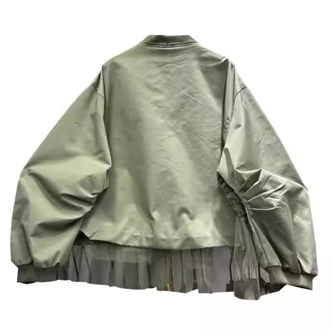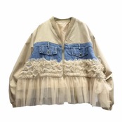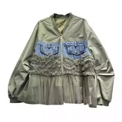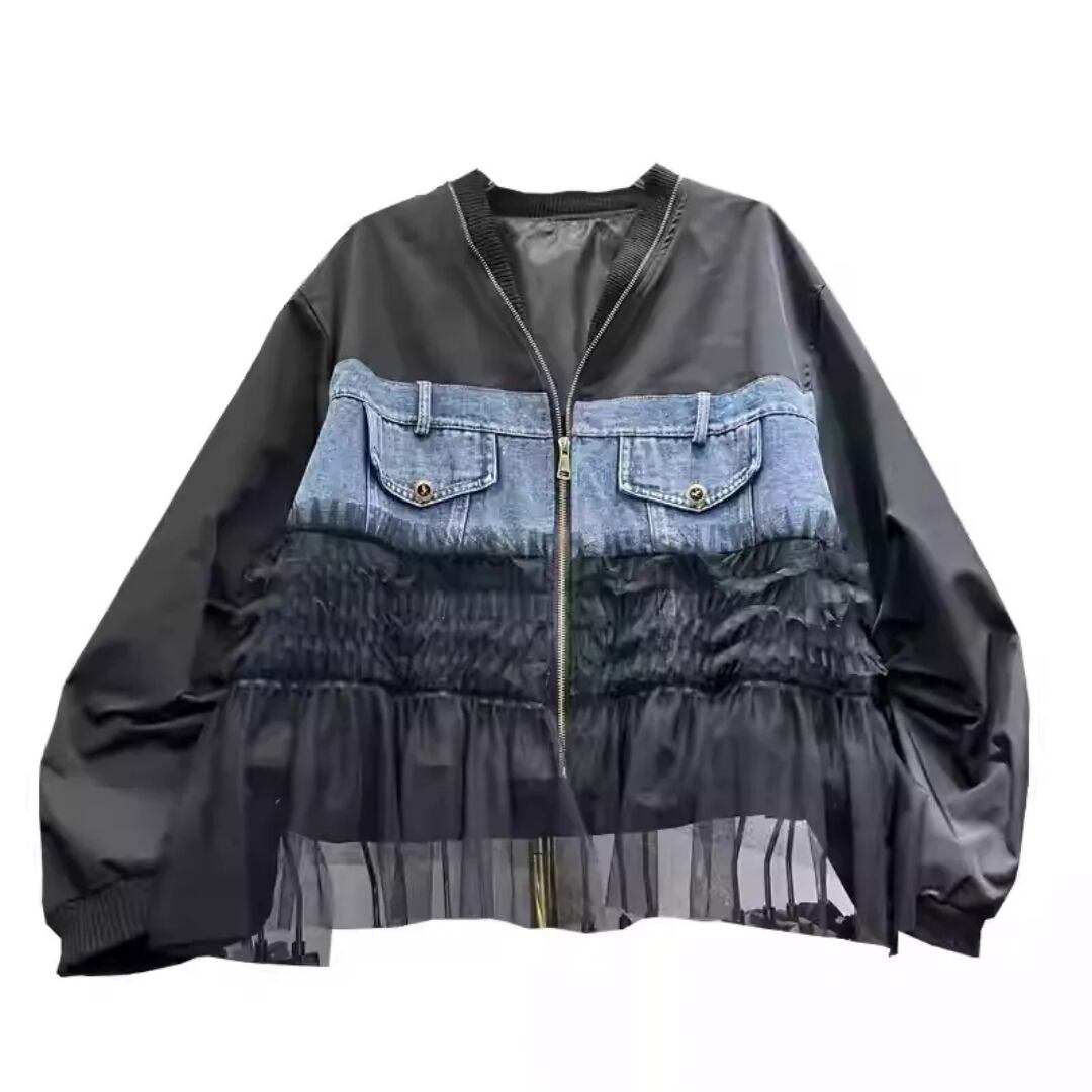Women's Zipper Denim & Mesh Patchwork Baseball Jacket with Large Pockets(CF019)