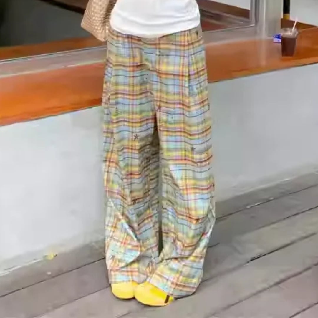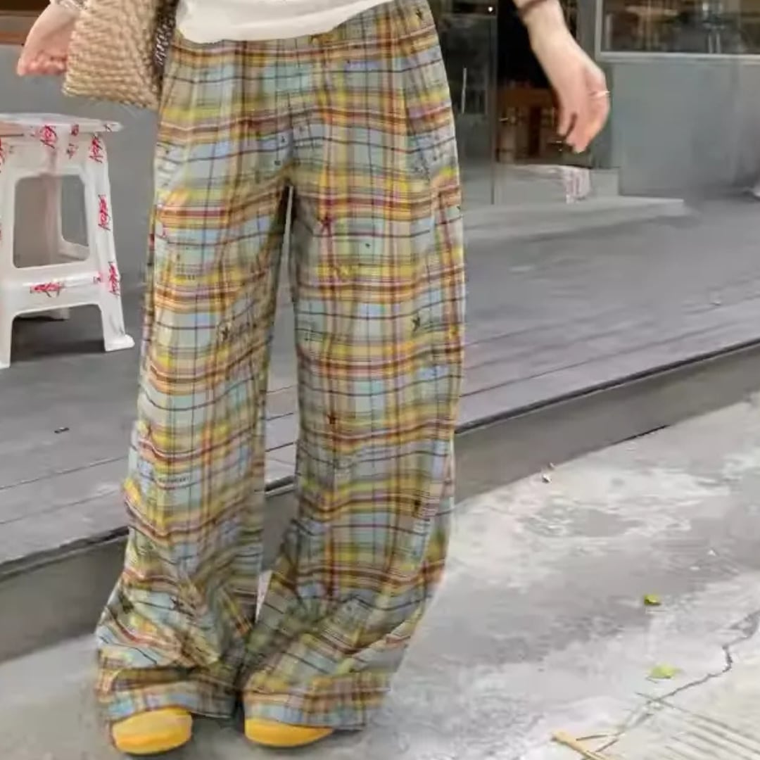 Vintage American Style Color-Block Plaid Wide-Leg Pants (CF046)