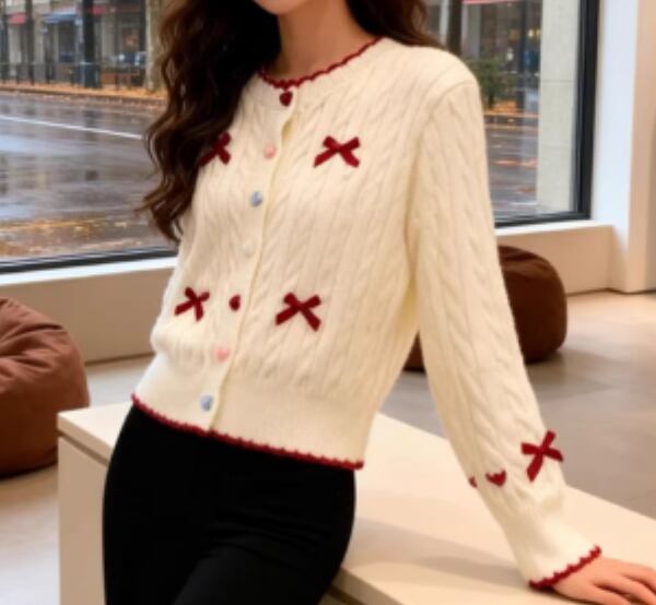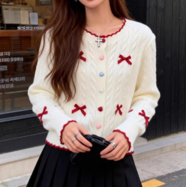 Sweet Style Short Knit Cardigan – Cable Knit Design with Heart Buttons(CF053)