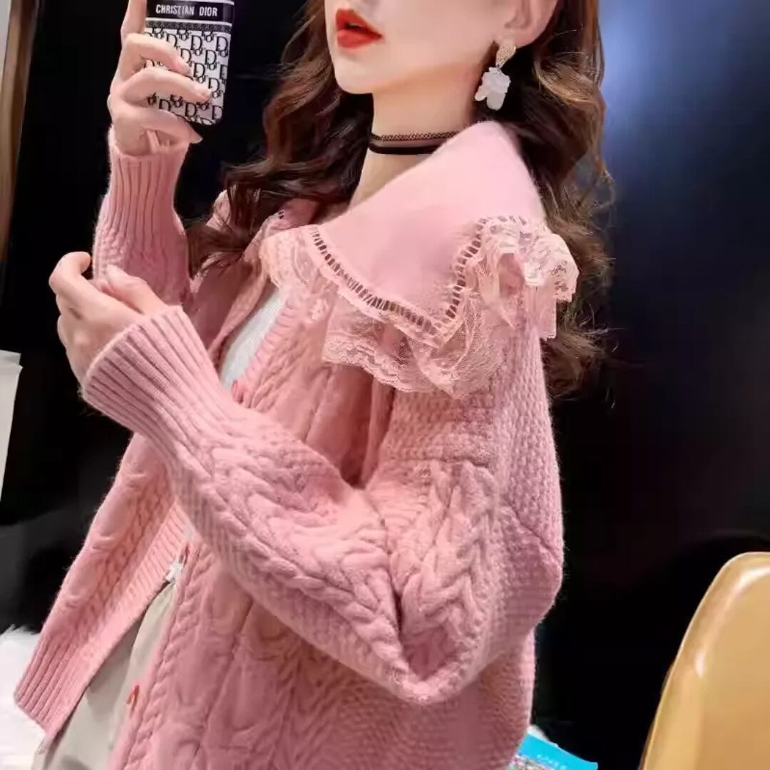 Loose Knit Cardigan with Lace Doll Collar(CF055)