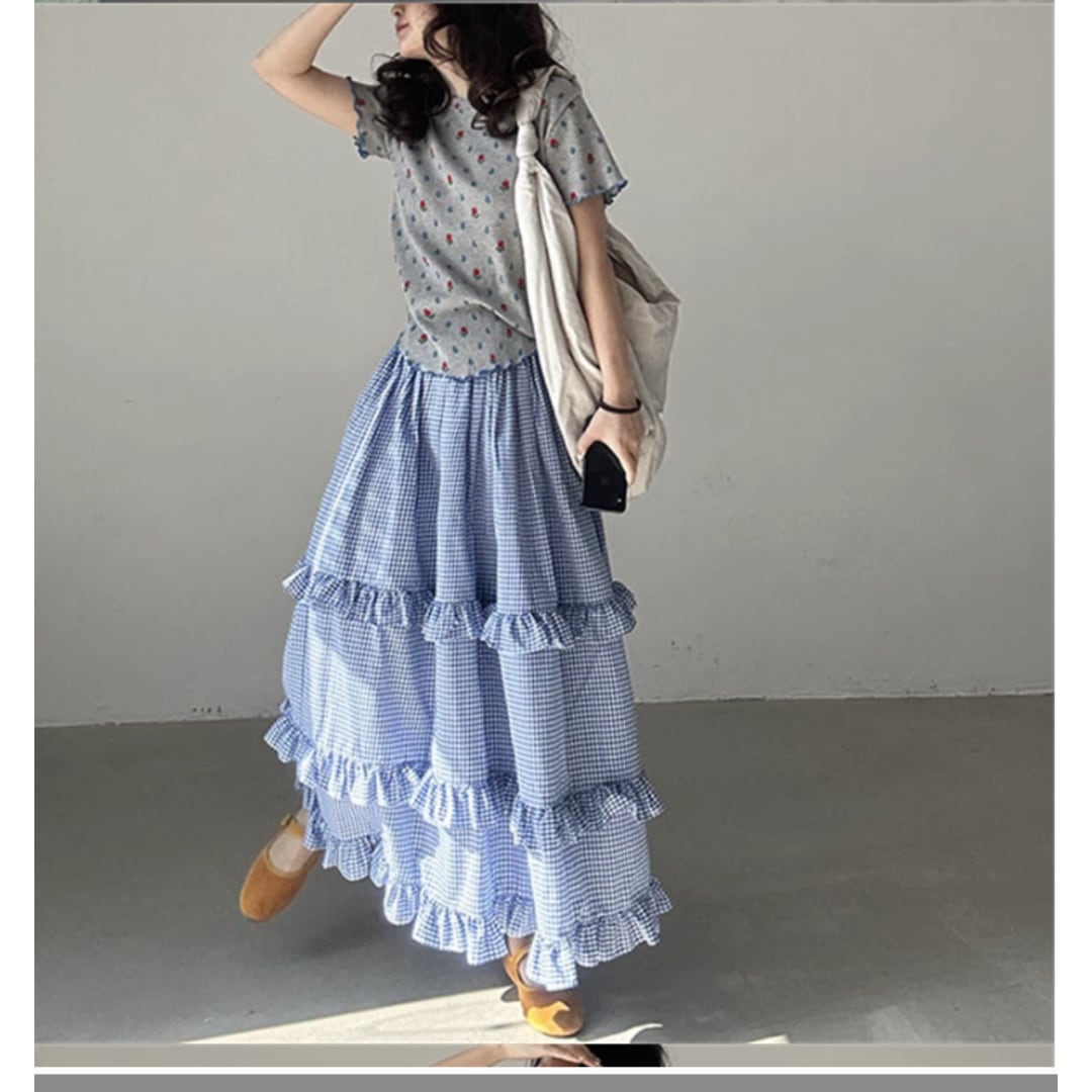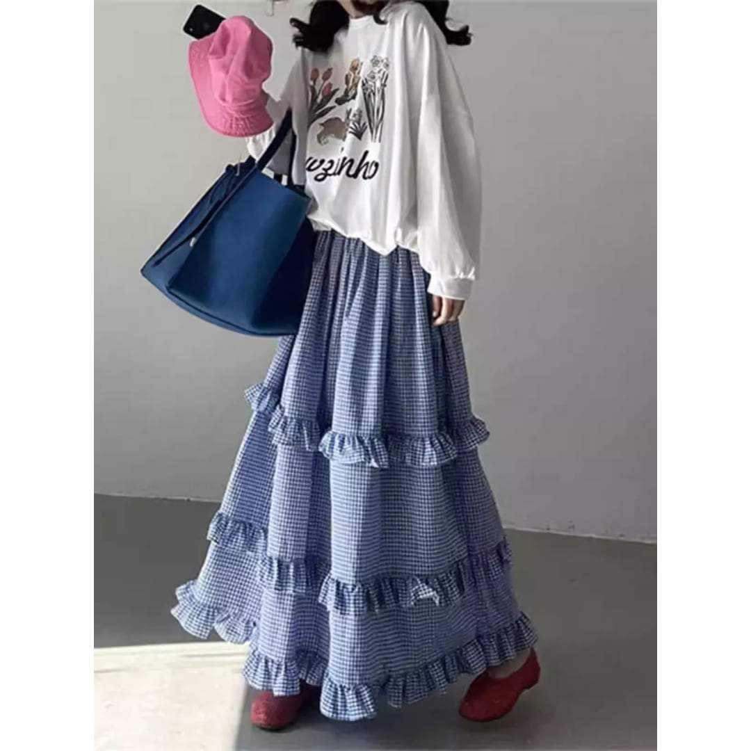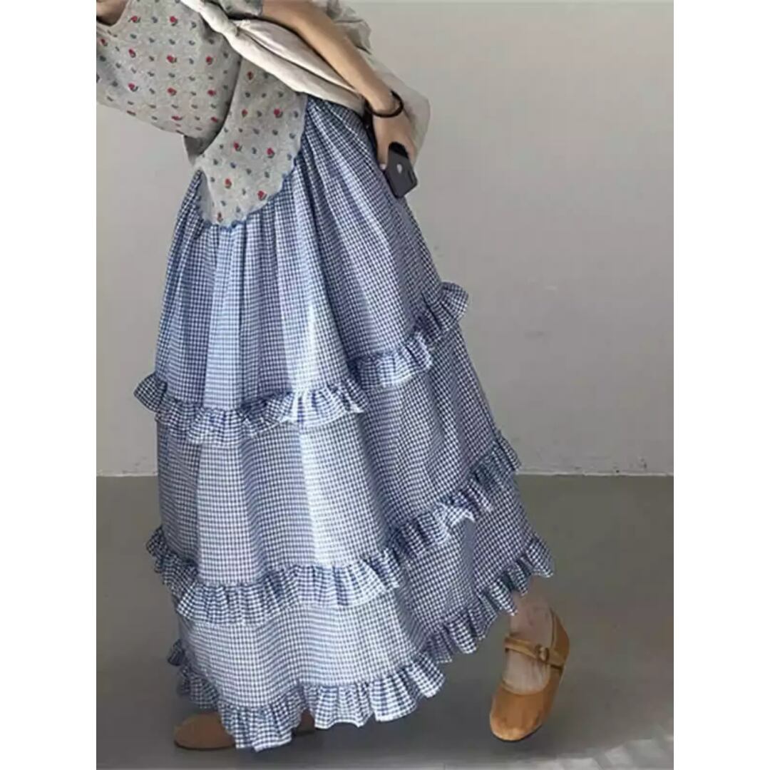 Chic Retro Versatile Elastic Waist Patchwork Ruffle Hem Skirt (CF081)