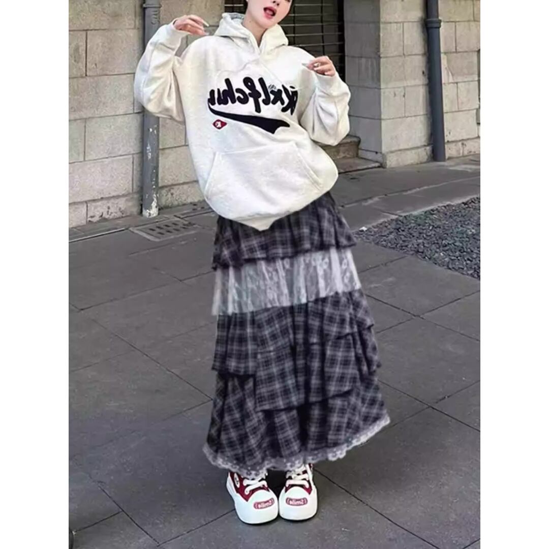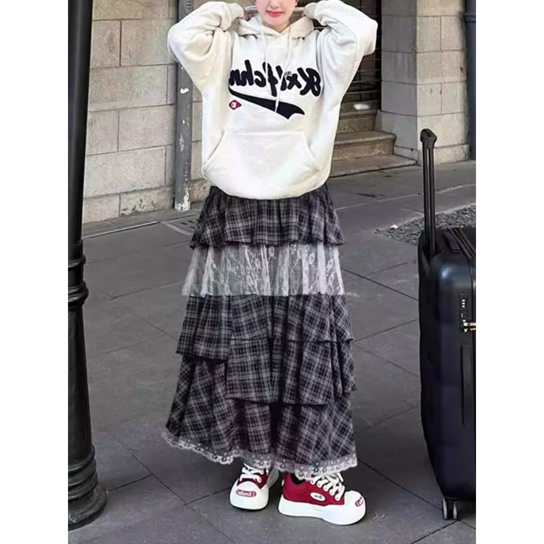 Black Plaid Lace Cake Skirt – Retro Designer Patchwork (CF083)